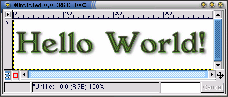 Adesso all'immagine deve essere aggiunto il testo reale. Primo, il colore attivo in primo piano deve essere cambiato. In questo caso, viene scelto un rosso (RGB 204 051 051). Quindi con il text tool attivo cliccate sull'immagine. Apparirà la finestra di dialogo Text Tool. Assicuratevi di aver selezionato le stesse configurazioni. Cliccate su OK per aggiungere un giallo "Hello World!" all'immagine e quindi spostatela nella posizione corretta.