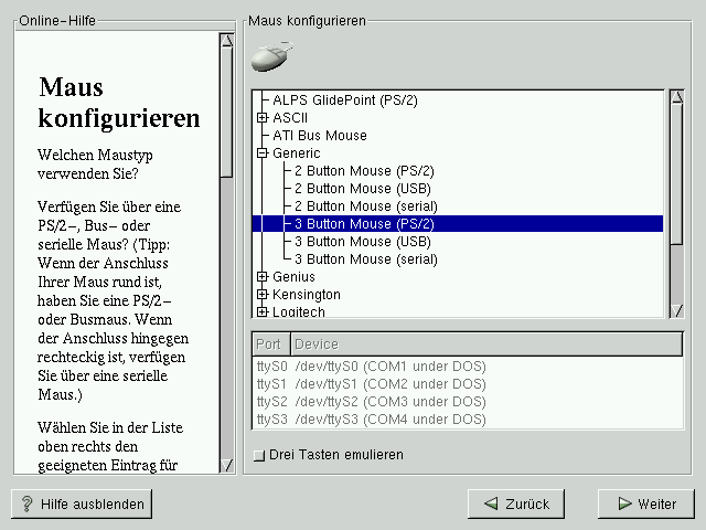 Wenn Sie eine PS/2- oder eine Bus-Maus haben, müssen Sie den Port und die Gerätebezeichnung nicht angeben. Wenn Sie eine serielle Maus haben, müssen Sie den richtigen Port und die Gerätebezeichnung wählen, an den Ihre serielle Maus angeschlossen ist.