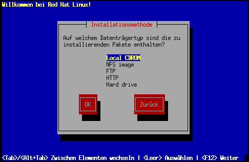 Wenn Sie Ihr System von einer lokalen Bootdiskette oder einer PCMCIA-Bootdiskette gestartet haben, legen Sie die Red Hat Linux CD-ROM ein, wählen Lokale CD-ROM (siehe Abbildung 6-3) aus und drücken dann die Eingabetaste.