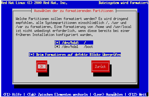 Nachdem Sie die zu formatierenden Partitionen ausgewählt haben, drücken Sie die Leertaste. Wenn Sie beim Formatieren der Dateisysteme eine Prüfung auf defekte Blöcke durchführen möchten (dies wird vor allem bei älteren Festplatten empfohlen), müssen Sie die Option Beim Formatieren auf defekte Blöcke überprüfen aktivieren. Wählen Sie OK aus, und drücken Sie die Leertaste.