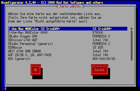 Wenn das Installationsprogramm nicht in der Lage ist, Ihre Grafikkarte zu erkennen, wird eine Liste mit Grafikkarten wie in Abbildung 6-20 angezeigt. Wählen Sie Ihre Grafikkarte in der Liste mit Hilfe der Pfeiltasten aus, und drücken Sie dann die Leertaste. Wenn Ihre Karte nicht in der Liste enthalten ist, wählen Sie den Eintrag Nicht aufgeführte Karte aus und drücken die Leertaste.