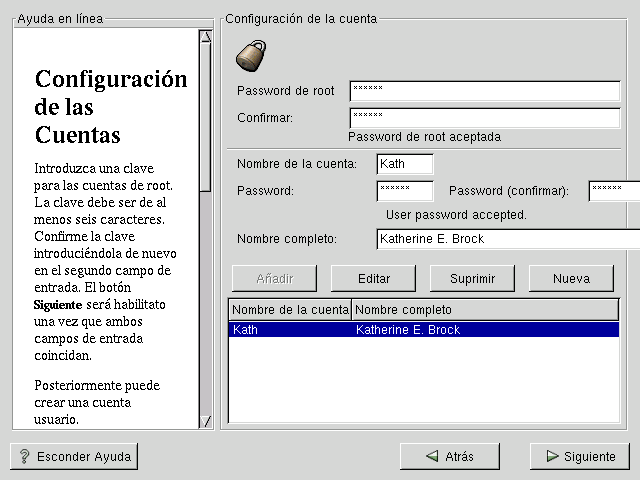 Teclee un nombre para una cuenta. Después teclee y confirme una contraseña para este usuario. Introduzca el nombre completo del usuario de la cuenta y pulse Enter. La información de la cuenta será añadida a la lista de cuentas, repitiendo esta operación puede añadir más usuarios.