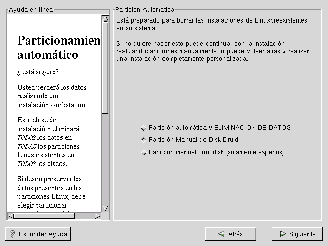 El particionamiento manual usando Disk Druid o fdisk está fuera de la competencia de este manual. Aunque Disk Druid será expuesto brevemente; existe información detallada en la Official Red Hat Linux Reference Guide en el CD de documentación. |