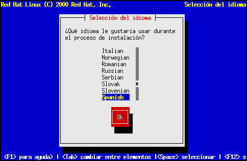 Usando las teclas de cursor, seleccione el idioma apropiado para usar durante la instalación y como idioma por defecto para el sistema, luego pulse Enter.