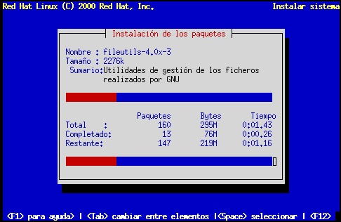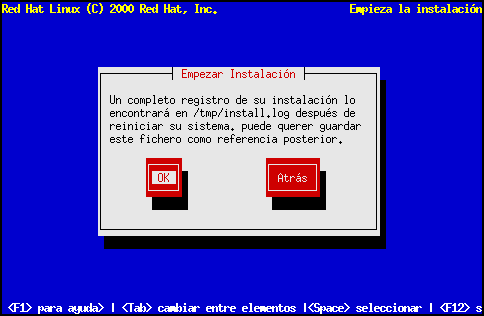 Un cuadro de diálogo similar al de Figura 6-21 aparecerá cuando el programa de instalación esté preparado para formatear particiones y cargar los paquetes software. El programa de instalación nombra el fichero de registro (/tmp/install.log) para esta instalación de Red Hat Linux. Seleccione OK y pulse Space para continuar.