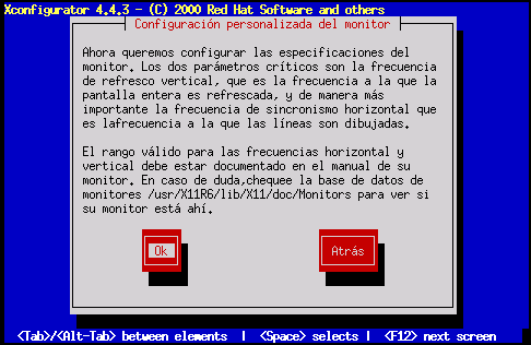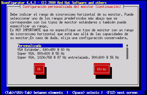 Si selecciona Custom, Xconfigurator le indicará que debe seleccionar el rango horizontal y vertical de sincronismo de su monitor (estos valores están normalmente en la documentación que acompaña a su monitor, o los puede conseguir de su vendedor o del fabricante).