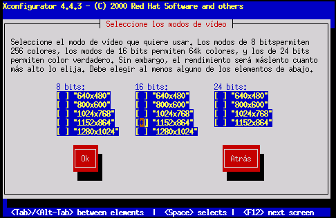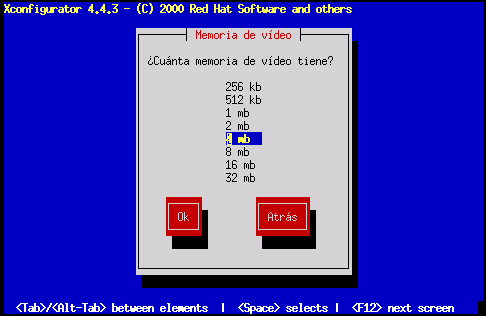 Si no está seguro de la memoria que tiene su tarjeta, consulte la documentación que acompaña a su tarjeta de vídeo. Elegir más memoria de la que presenta su tarjeta no la dañará, pero puede ocurrir que el servidor XFree86 arranque incorrectamente.