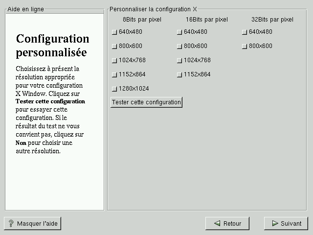 Si vous souhaitez personnaliser la configuration de X Window, sélectionnez le bouton Personnaliser la configuration X. Le système affiche alors un autre écran vous permettant de sélectionner la résolution souhaitée (voir Figure 5-20). Une fois de plus, vous aurez la possibilité de tester la configuration.