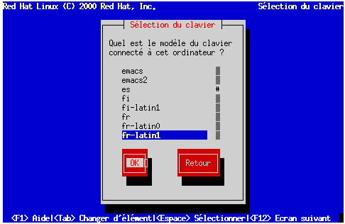 A l'aide des touches de direction, sélectionnez le type de clavier à utiliser au cours de l'installation et comme valeur système par défaut, puis appuyez sur la touche Entrée.