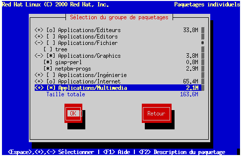 Pour consulter la liste des paquetages, utilisez les touches de direction afin de sélectionner le groupe de votre choix et appuyez ensuite sur Entrée ou sur la barre d'espacement. Lorsque vous sélectionnez une liste, le signe + (fermé) se transforme en - (ouvert) ; la liste des paquetages de cette catégorie s'affiche. Le signe * s'affiche à côté des paquetages sélectionnés. Appuyez sur Entrée ou sur la barre d'espacement pour sélectionner ou désélectionner des paquetages.