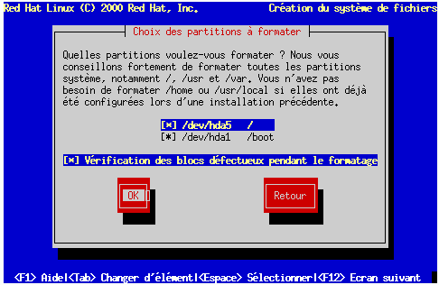 Après avoir sélectionné les partitions à formater, appuyez sur la barre d'espacement. Pour rechercher les éventuels blocs défectueux lors du formatage de chaque système de fichiers (procédure recommandée pour les utilisateurs disposant de disques durs plus anciens), activez l'option de vérification des blocs défectueux durant le formatage. Appuyez sur OK puis sur la barre d'espacement.
