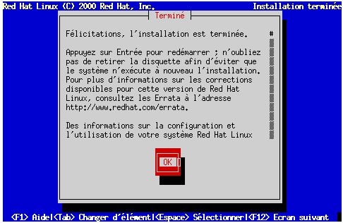 Pour redémarrer le système Red Hat Linux que vous venez d'installer, appuyez sur la touche Entrée.