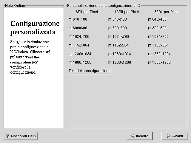 Se preferite modificare la configurazione di X, assicuratevi che il flag Customize X Configuration sia stato selezionato. Se scegliete di modificarla, appare una finestra che vi permette di scegliere la risoluzione e la profondità di colore (vedasi Figura 5-20). A questo punto avete ancora la possibilità di verificare la configurazione grafica.