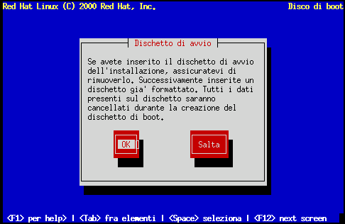 Se volete creare un dischetto di boot selezionate Yes e premete Space. Se non volete crearlo selezionate Skip e premete Space.