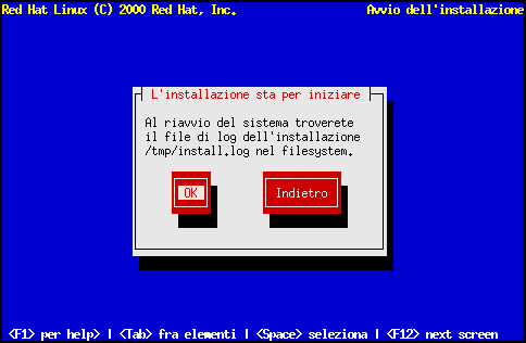 La finestra presentata nella Figura 6-21 appare quando il programma di installazione è pronto per formattare le partizioni e per caricare i pacchetti software. Il programma di installazione crea il file di log (/tmp/install.log) per questa installazione Red Hat Linux. Scegliete OK e premete Space per continuare.