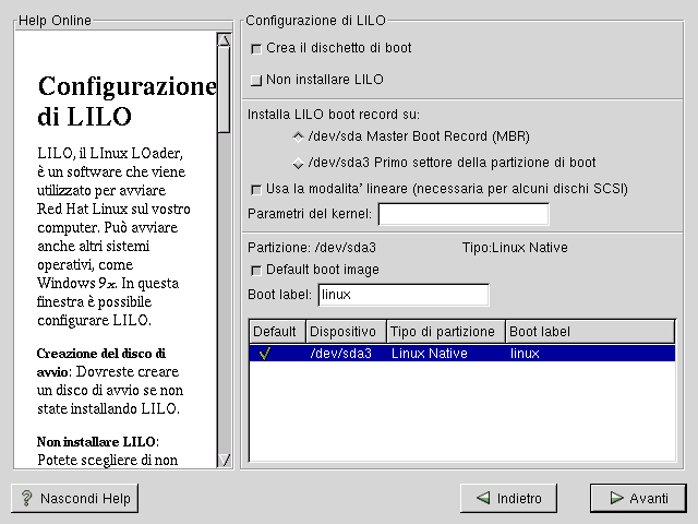 Se per qualsiasi motivo scegliete di non installare LILO, non sarete in grado di avviare il vostro sistema Red Hat Linux direttamente, ma dovrete utilizzare un disco di boot o un altro boot manager. Utilizzate questa opzione solo se siete sicuri di poter avviare Red Hat Linux in un altro modo! |