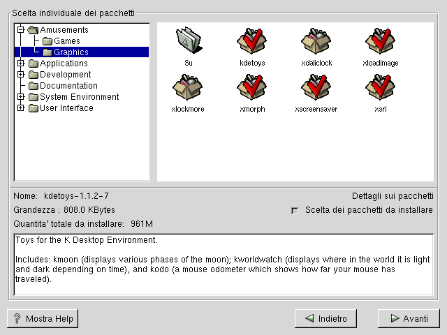 Per selezionare un pacchetto individuale, effettuate un doppio-clic su esso, o selezionatelo una volta per evidenziarlo e cliccate sul pulsante Select Package For Installation. Una spunta rossa apparirā su tutti i pacchetti che avrete selezionato per l'installazione.