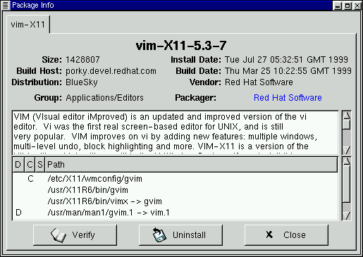 Beim Überprüfen eines Pakets werden sämtliche Dateien in dem Paket geprüft, um sicherzustellen, dass sie mit den in Ihrem System vorhandenen übereinstimmen. Die Prüfsumme, die Dateigröße, die Berechtigungen und die Eigentümerattribute werden mit den Aufzeichnungen der Datenbank abgeglichen. Diese Überprüfung kann vorgenommen werden, wenn Sie vermuten, dass eine der Dateien des Programms aus irgendeinem Grund beschädigt wurde.
