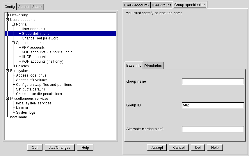 Abrir Config => Users accounts => Normal => User accounts. Puede que Linuxconf muestre una pantalla filtro (véase ).