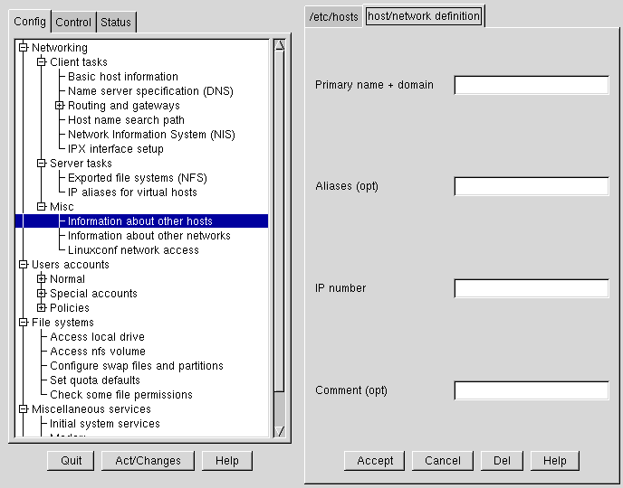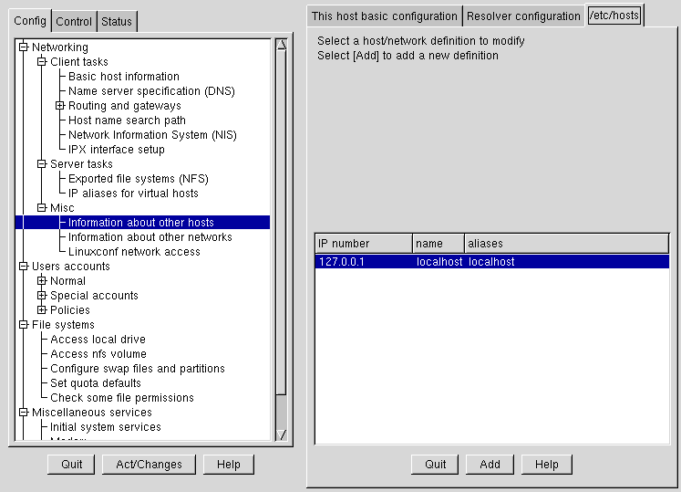 Se pueden añadir, modificar o borrar entradas del fichero /etc/hosts utilizando linuxconf. Abrir Config => Networking => Misc => Information about other hosts.