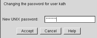 Linuxconf pedirá que se introduzca la nueva contraseña. También hay un campo llamado Confirmation donde se necesita volver a teclear la contraseña, para impedir que se teclee mal la contraseña. Véase la sección de nombre Añadiendo una Cuenta de Usuario para aprender a elegir una contraseña. Si no se quiere cambiar la contraseña, seleccionar Cancel. Una vez introducida la contraseña seleccionar Accept.