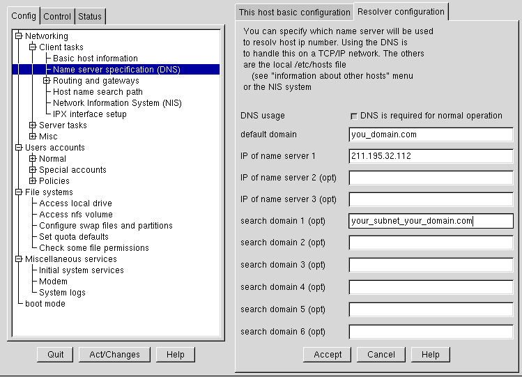 Para especificar el servidor de nombres, abrir Config => Networking => Client tasks => Name server specification (DNS).