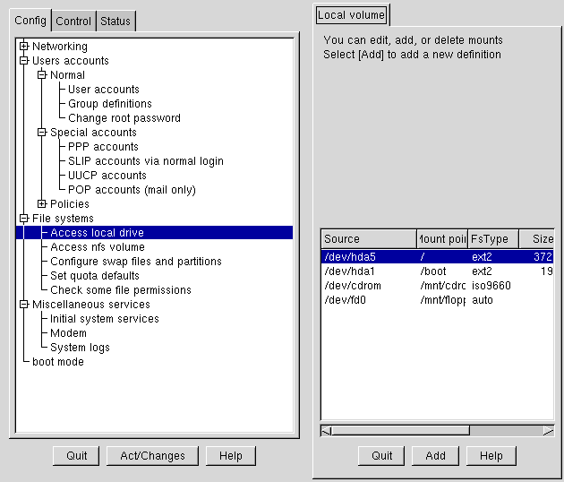 Aunque linuxconf puede hacer casi lo mismo que las herramientas del panel de control, hay dos áreas donde todavía el panel de control no puede ser sustituido: