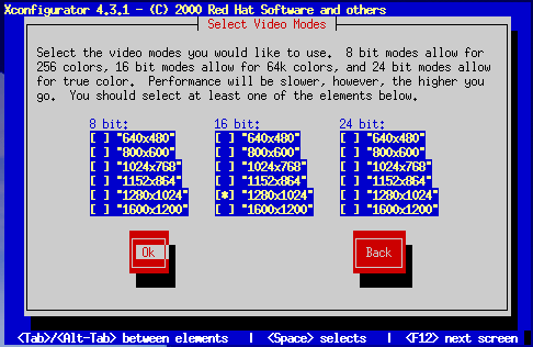 Seleccione Use Default para aceptar la resolución y la intensidad del color. Si selecciona Let Me Choose, aparecerá la ventana de diálogo Select Video Modes (Figura 14-43) que le mostrará los posibles tipos de vídeo soportados desde su monitor.