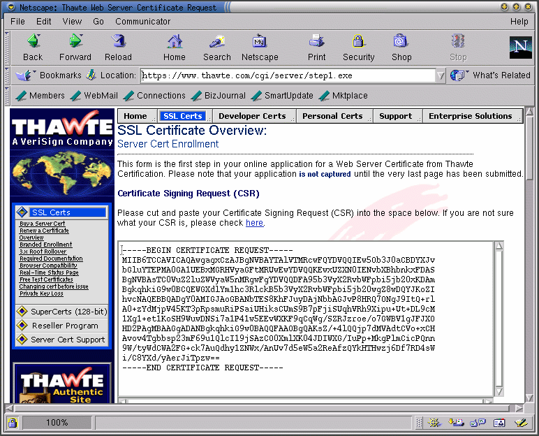 Para cortar y pegar el conteneido del fichero (Si esta usando X), primero cd a /etc/httpd/conf/ssl.csr. Mostrara el conteneido de server.csr con el comando cat server.csr. Señala el contenido de el fichero y pulsa con el botón izquerdo del ratón. Pulsa en la caja de texto en la páginaWeb. Pulsa el botón central para pegar el texto señalado.