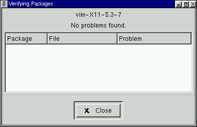 L'opération de vérification d'un paquetage contrôle tous les fichiers qu'il contient pour veiller à ce qu'ils correspondent à ceux présents sur le système. La somme de contrôle, la taille du fichier, les autorisations et les attributs du propriétaire sont tous vérifiés par rapport à la base de données. Cette vérification peut être utilisée si vous pensez que l'un des fichiers du programme est peut-être corrompu.