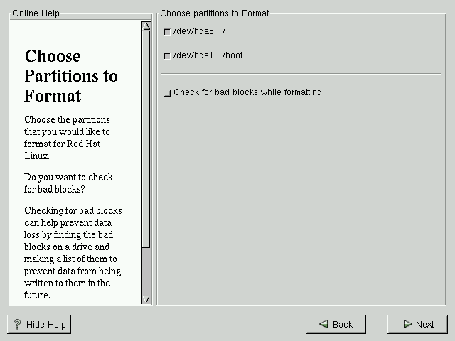 Sélectionnez les partitions que vous souhaitez formater. Toutes les nouvelles partitions doivent être formatées. De même, toutes les partitions existantes contenant des données dont vous n'avez plus besoin doivent être formatées. Toutefois, des partitions telles que /home ou /usr/local ne doivent pas être formatées si elles contiennent des données que vous souhaitez conserver (voir Figure 15-15).
