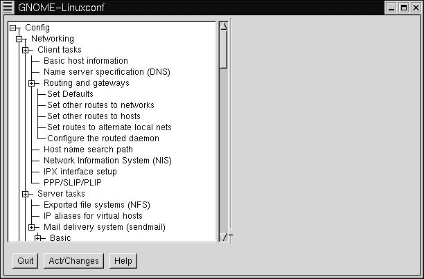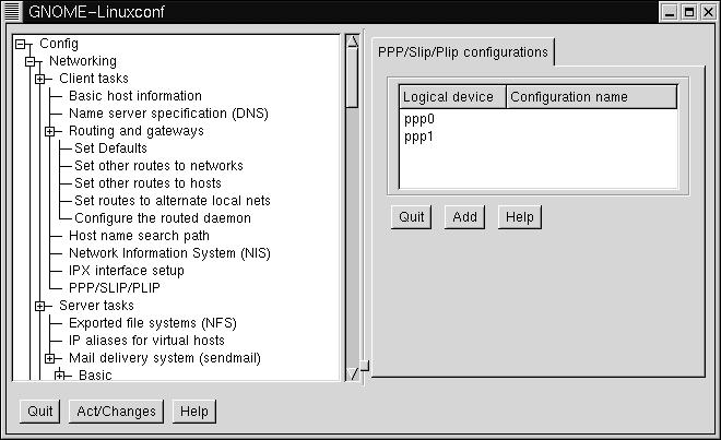 Linuxconf's PPP section is fairly simple. First of all, open up Linuxconf. This must be done as root. Here's a shot of Linuxconf in action: