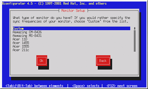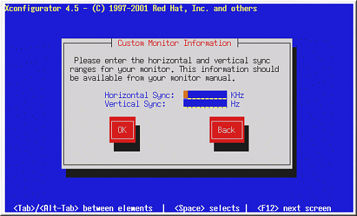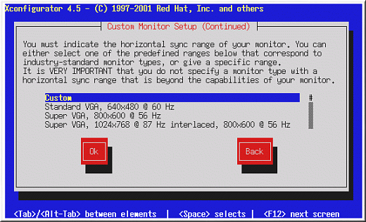 If you select Custom, Xconfigurator prompts you to select the horizontal sync range and vertical sync range of your monitor (these values are usually available in the documentation which accompanies your monitor, or from your monitor's vendor or manufacturer).