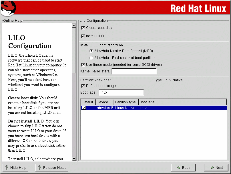 In order to be able to boot your Red Hat Linux system, you usually need to install LILO (the LInux LOader). You may install LILO in one of two places: