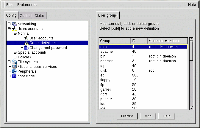 Introduzca un nombre de grupo. Asimismo, puede estar interesado en especificar los miembros del grupo; esto se realiza en el campo Alternate members. La lista de usuarios debe estar delimitada por un espacio, es decir, debe haber un espacio entre un nombre de usuario y el siguiente. Deje el campo Group name en blanco para que el sistema asigne el Group ID (GID) al nuevo grupo. Cuando haya terminado, pulse el botón Accept para que se cree el grupo.