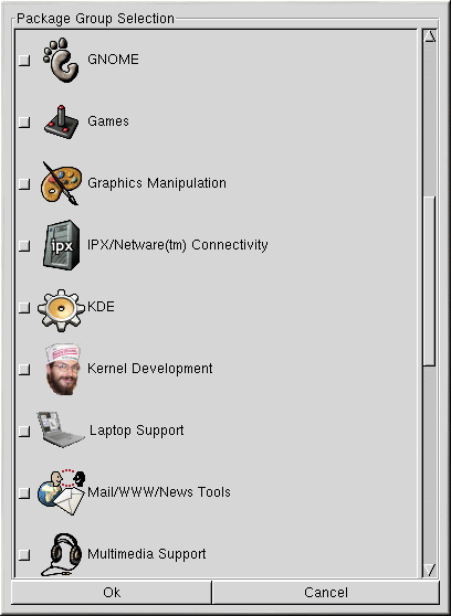 Haga click en Packages para configurar los paquetes que desee instalar. Esta sección le permite elegir los paquetes que quiere instalar. Se trata de los mismos grupos de paquetes que los del programa de instalación de Red Hat Linux.