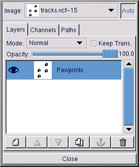 La ventana de diálogo Layers muestra todas las capas en la imagen. Como se puede observar en el Figura 9-17, la imagen sólo incluye una capa, a la que se le cambió el nombre por el de Pawprints (haga click con el botón derecho del ratón en la capa, y después escoja Edit layer attributes y rellénelo con un nombre descriptivo).