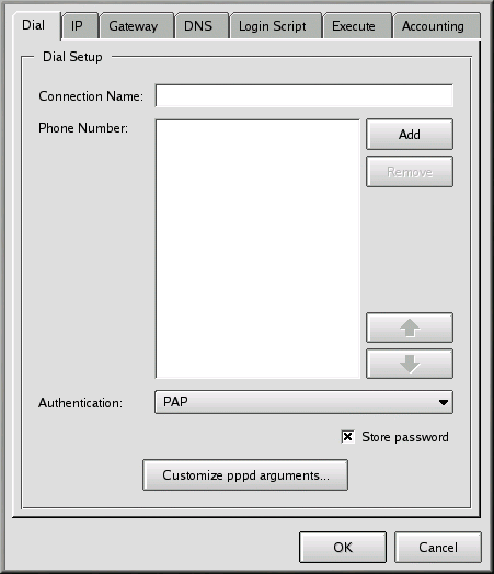 Puede personalizar las opciones que quiera pasar a pppd en el campo Edit pppd arguments pulsando el botón Customize pppd Arguments.