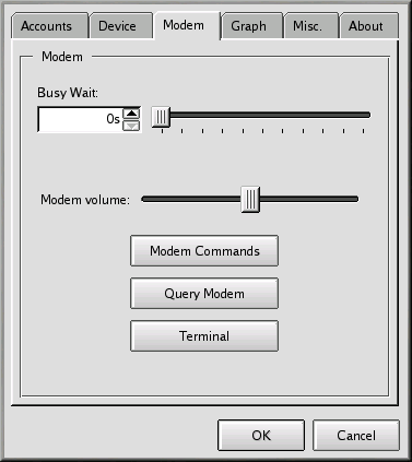 En la etiqueta Modem, puede probar la cofiguración de su módem (vea el Figura 6-25). Ajustando la barra de desplazamiento que aparece junto a Modem volume, puede modificar el volumen de su módem mientras marca y se conecta.