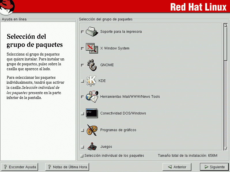 Algunos paquetes (como el kernel o algunas librerías) son necesarios para poder ejecutar Red Hat Linux y no estarán disponibles para ser o no seleccionados. Estos paquetes básicos se seleccionan por defecto.