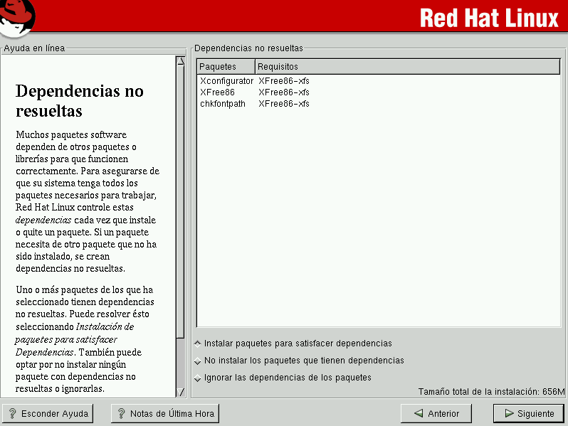 La pantalla Dependencias no resueltas tan sólo aparecerá si los paquetes que ha seleccionado la requieren. En la parte inferior de la pantalla, la casilla de verificación Instalar paquetes para satisfacer las dependencias estará seleccionada por defecto. Si la deja seleccionada, el programa de instalación resolverá las dependencias automáticamente añadiendo los paquetes necesarios en función de la lista de paquetes que haya seleccionado.