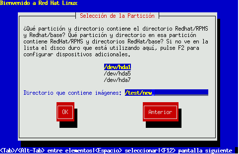 Introduzca el nombre del dispositivo de la partición que contiene las imágenes ISO de Red Hat. Existe también un campo etiquetado como Directorio de imágenes. Si las imágenes ISO no están en el directorio raíz de esa partición, introduzca la ruta de las imágenes de ISO (por ejemplo, si las imágenes ISO están en /test/new/RedHat, teclee /test/new).