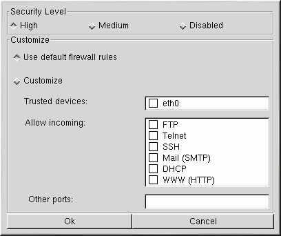 Cliquez sur le bouton Firewall pour configurer les paramètres du pare-feu du système. La fenêtre du pare-feu, indiquée dans la Figure 2-4, est identique à celle qui est utilisée dans le programme d'installation Red Hat Linux. Reportez-vous au Guide d'installation officiel Red Hat Linux pour x86 pour avoir plus d'informations sur la configuration des paramètres du pare-feu.