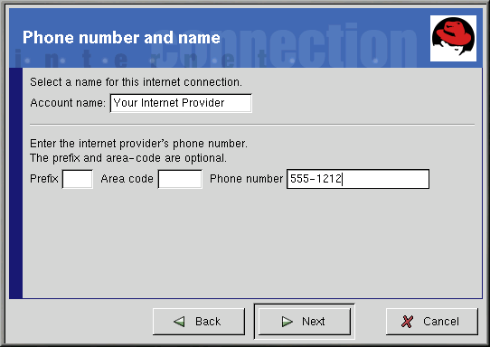 Dans la boîte de dialogue Phone number and name (reportez-vous à la Figure 6-5), entrez le nom que vous voulez attribuer à votre compte et le numéro de téléphone de votre fournisseur d'accès Internet. Si vous devez entrer le code zonal, faites-le ici.