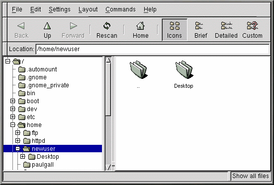 Votre bureau par défaut comprend un dossier montrant le contenu de votre répertoire /home (voir la Figure 2-3). Bien que vous puissiez spécifier d'autres manières d'afficher le contenu de vos répertoires /home et autres sur le système, en général, le volet gauche du gestionnaire de fichiers montre l'arborescence des répertoires tandis que le volet droit montre le contenu de ce répertoire.