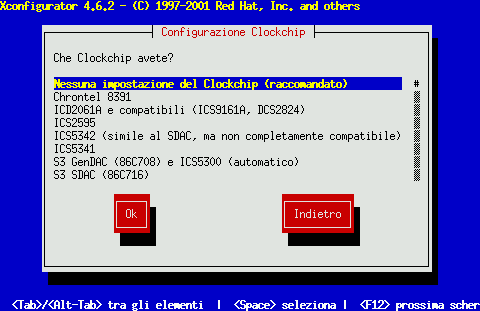 Successivamente selezionate un clockchip se la vostra scheda video lo supporta. La scelta consigliata è Nessuna impostazione del clockchip, poiché Nella maggior parte dei casi XFree86 può rilevare il clockchip corretto in modo automatico.