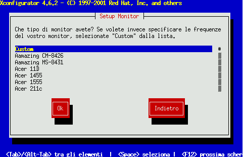 Xconfigurator visualizza innanzitutto un elenco di monitor (vedere la Figura 5-10). Se il vostro monitor è presente in questo elenco, selezionatelo e premete Invio. Altrimenti selezionate Custom.