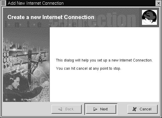 rp3 is available on any RedHat system running RedHat 6.2 or later. It is located on your GNOME menu under Internet- called "Dialup Configuration Tool". It is perhaps the simplest to use of the tools this HOWTO covers. When you start it up, it presents you with a screen that looks like this: