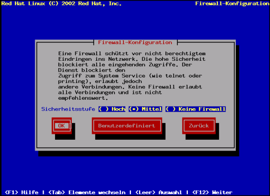 Red Hat Linux bietet einen Firewall-Schutz als weitere Sicherheit für Ihr System. Die Firewall befindet sich zwischen Ihrem Computer und dem Netzwerk und bestimmt, auf welche Ressourcen Ihres Computers Remote-Benutzer des Netzwerks zugreifen können. Eine richtig eingestellte Firewall kann die Sicherheit Ihres Systems erheblich verbessern.