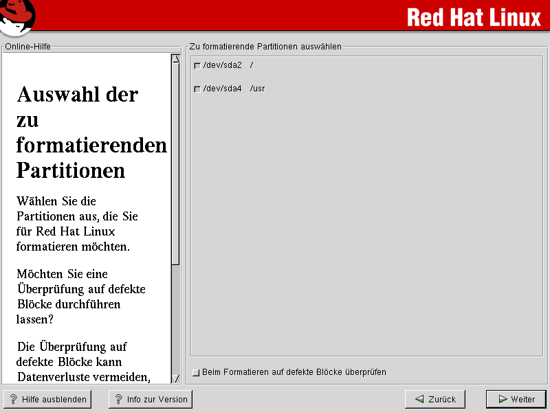 | Zurück | Kapitel 4. Installation von Red Hat Linux | Nach vorne |